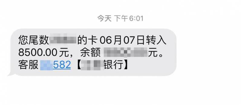 银行卡收到8500元的短信提醒