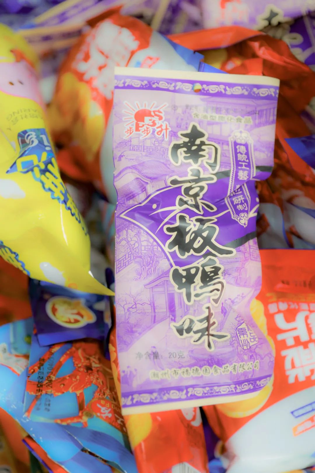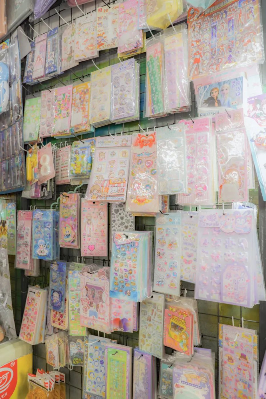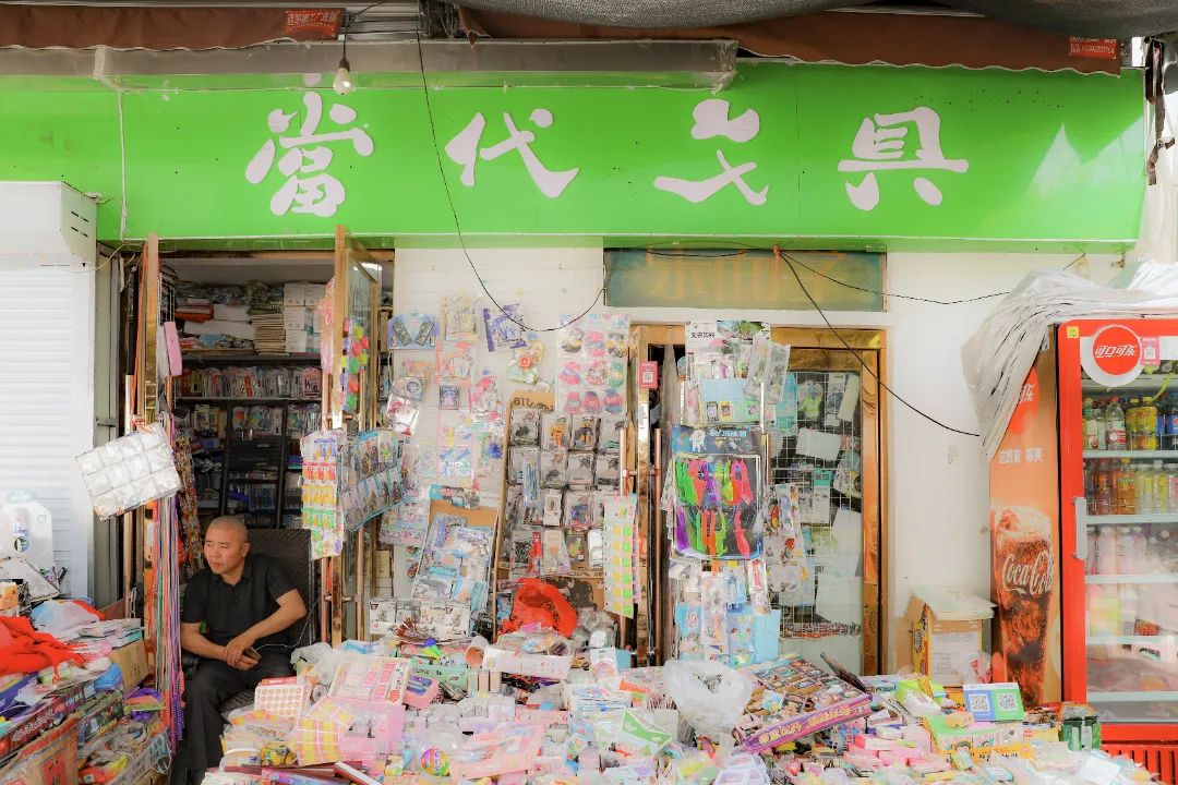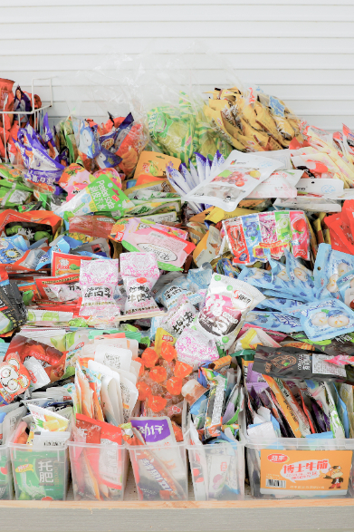 在门口的堆满零食和玩具的摊子上