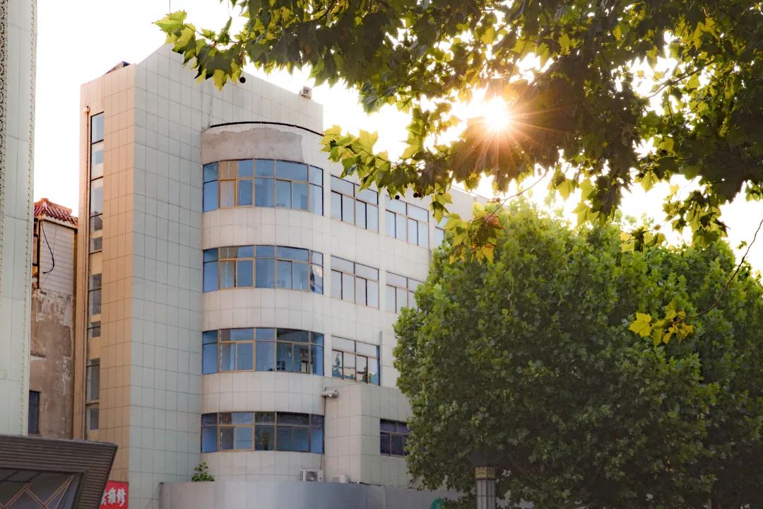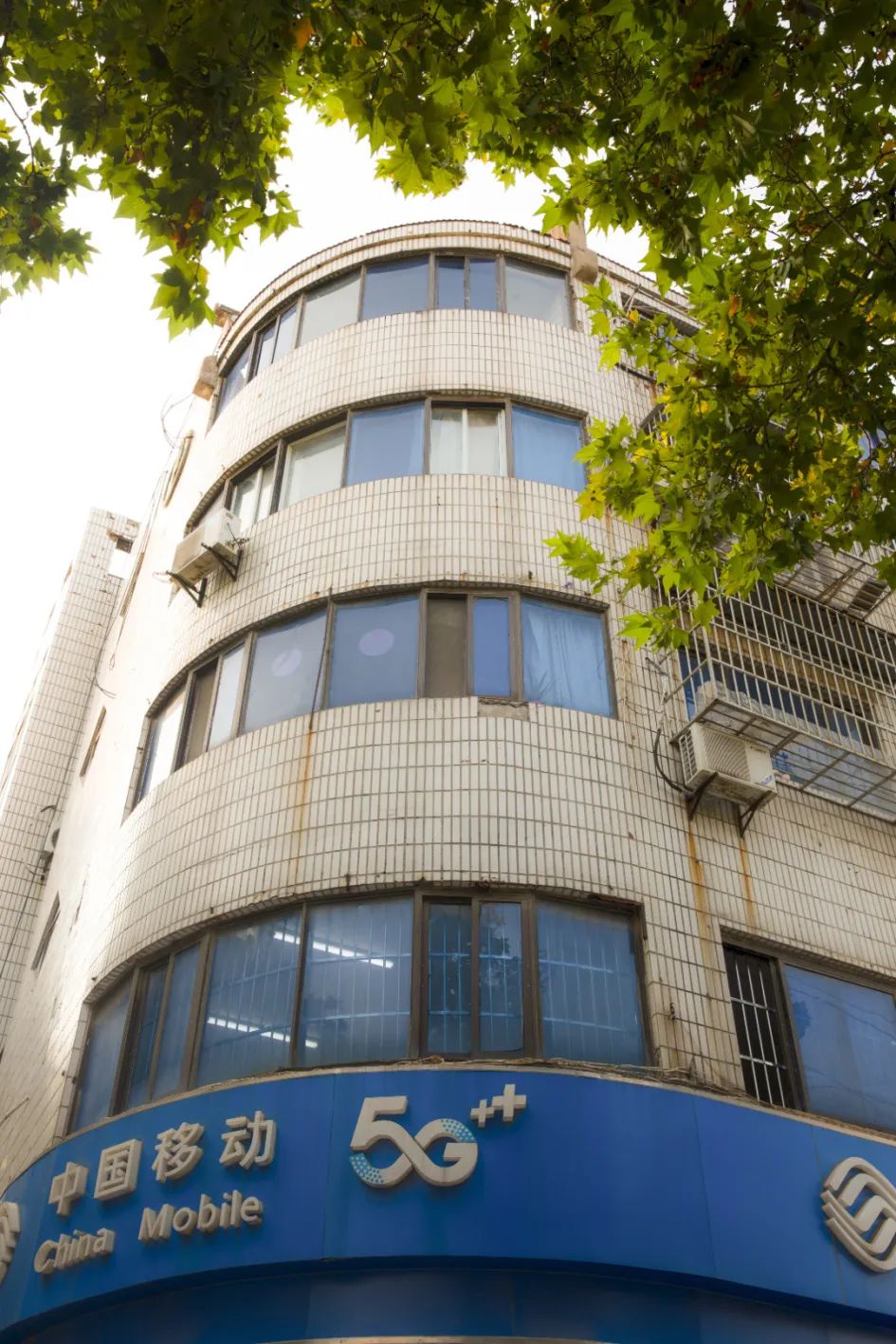 镶着蓝绿色玻璃的老式居民楼
