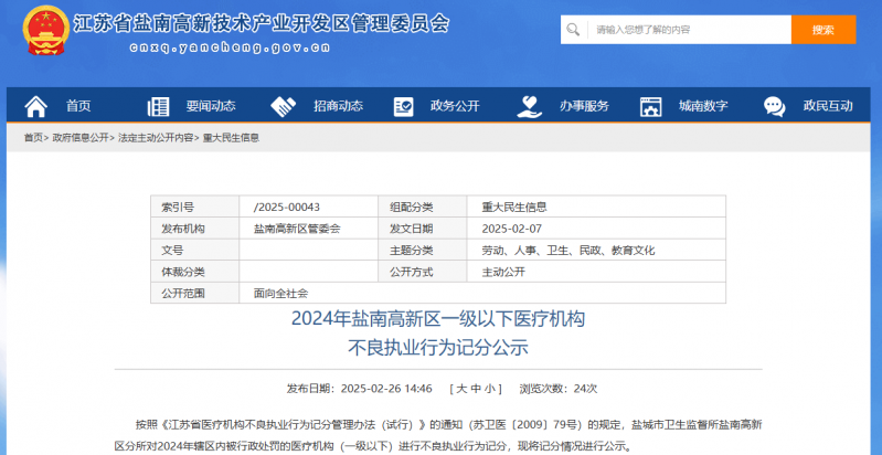 2024年盐南高新区一级以下医疗机构不良执业行为记分公示,依据《江苏省医疗机构不良执业行为记分管理办法(试行)》规定,盐城市卫生监督所盐南高新区分所公示辖区内被罚医疗机构记分情况。