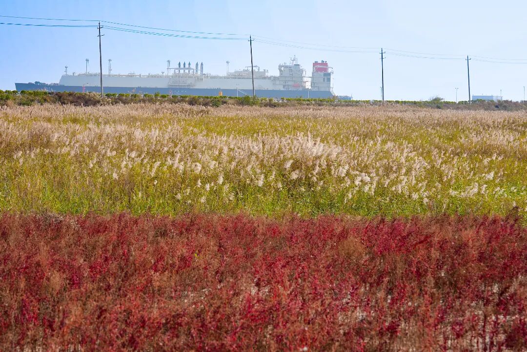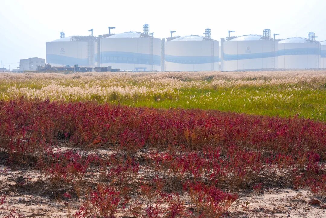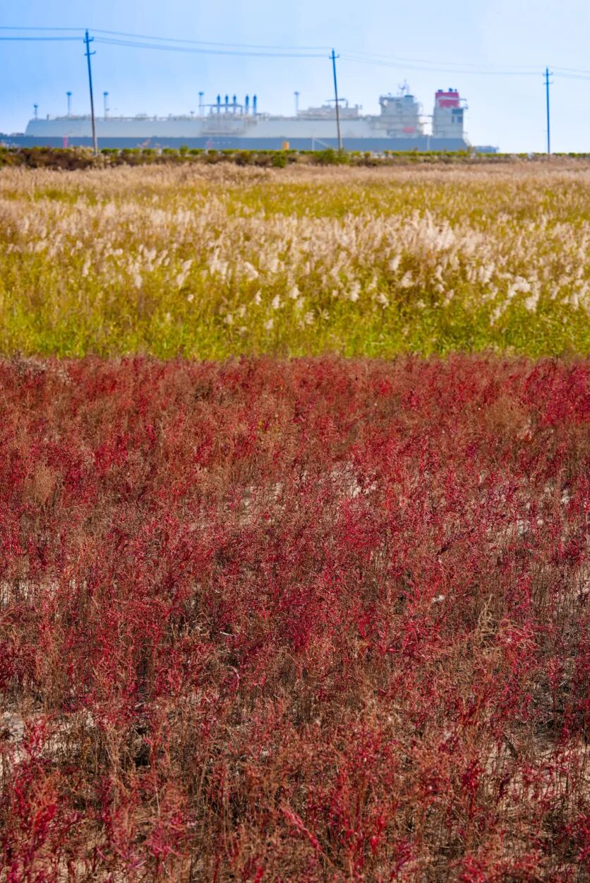 沿着海堤公路行驶,视线突然被盐蒿独有的炽红攫住。它们一簇簇、一蓬蓬,从公路旁一直漫到芦苇荡深处。LNG储罐在红潮中若隐若现,工业的冷峻与自然的奔放在此刻达成奇妙的和解。