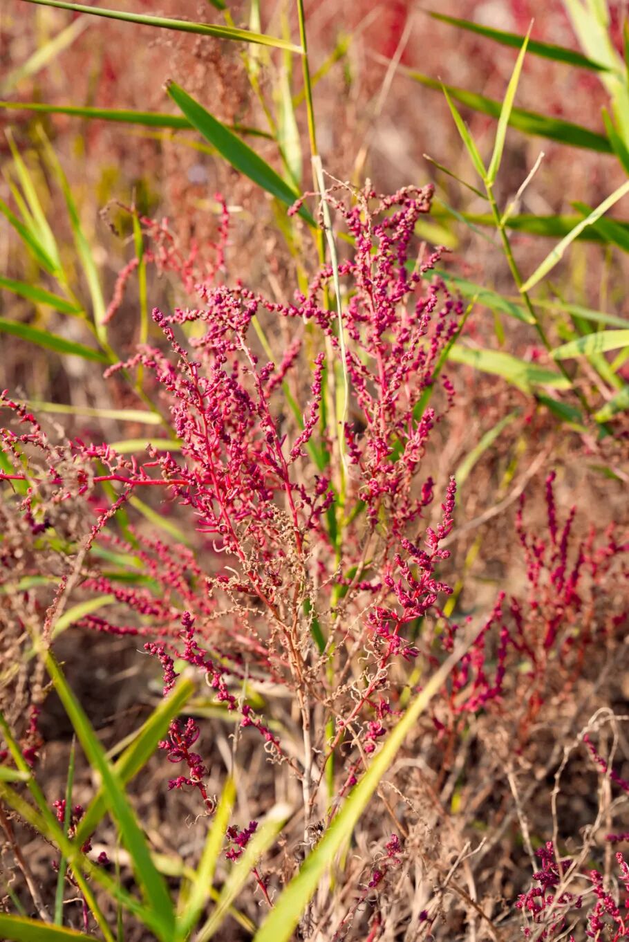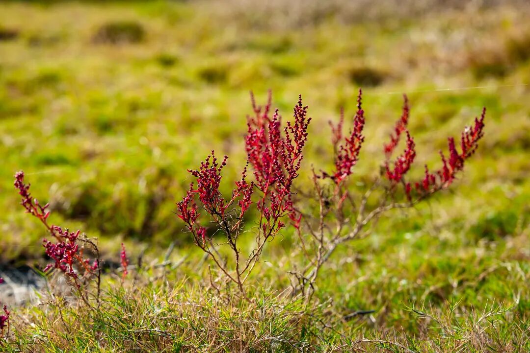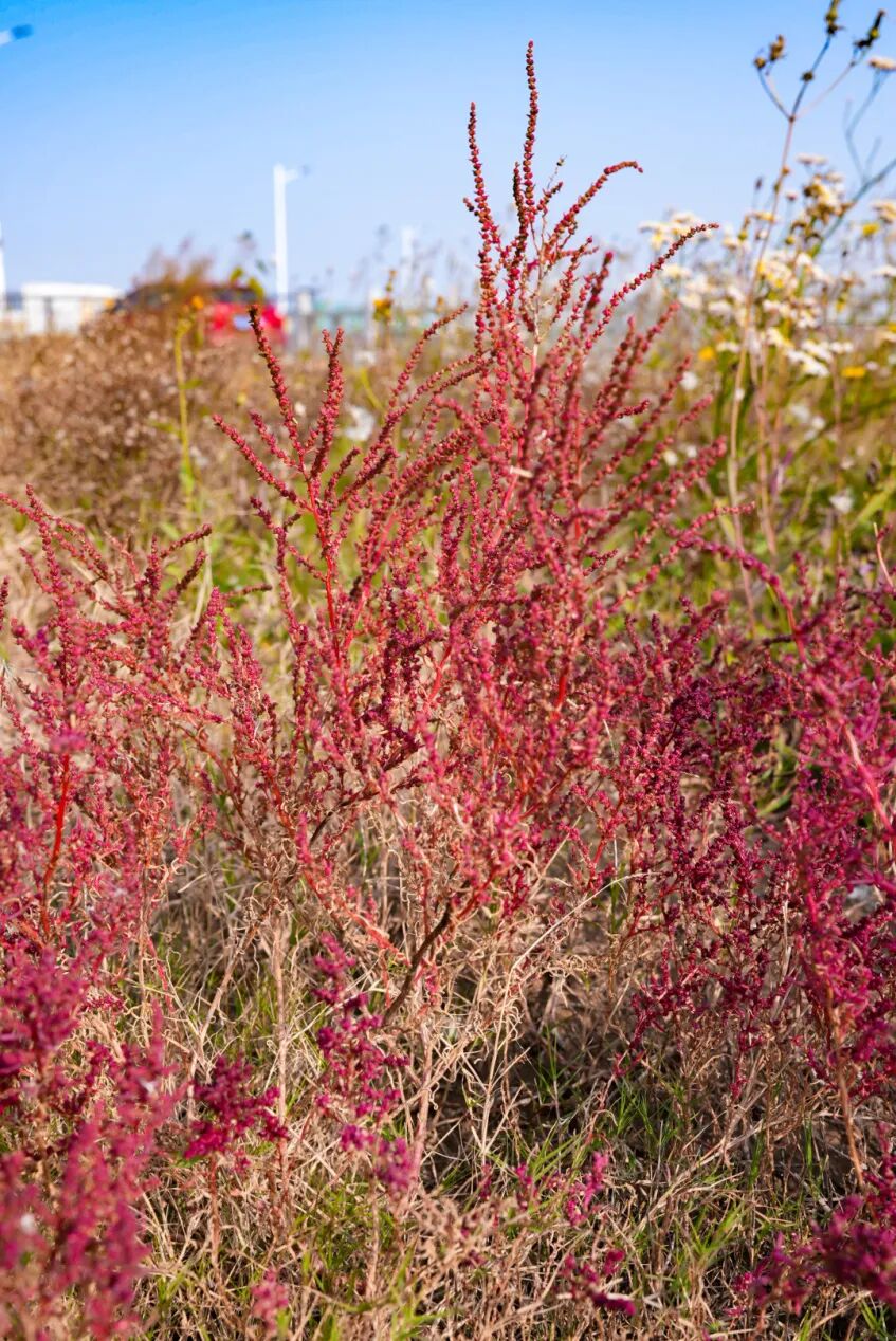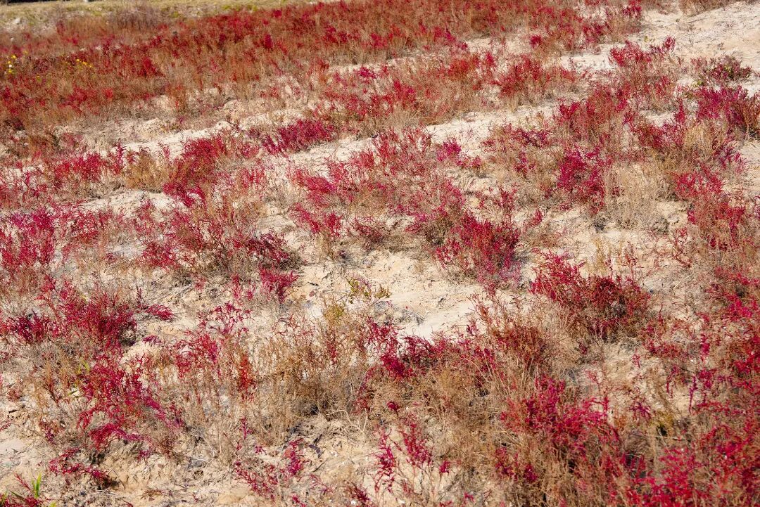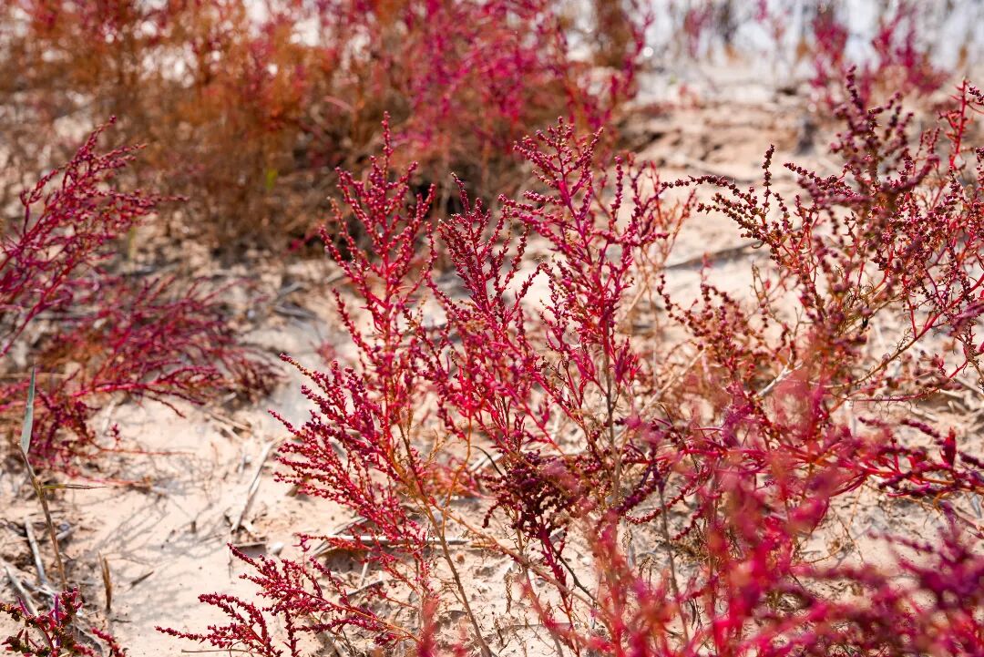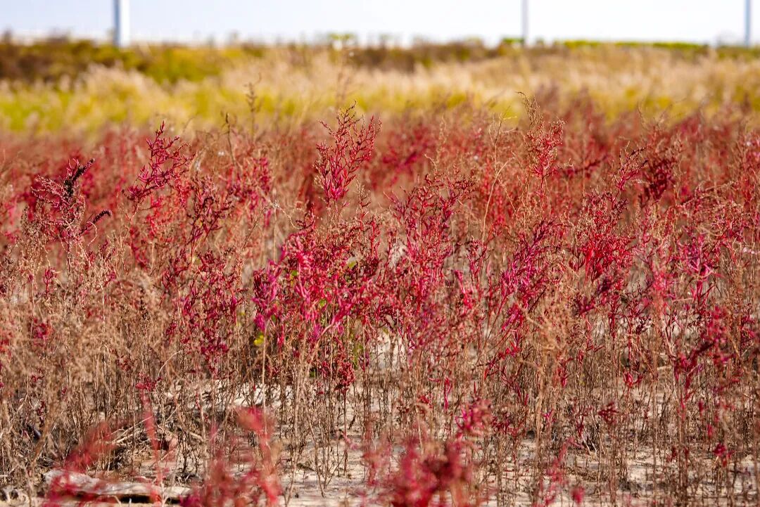 风一吹过,株株盐蒿便齐齐摇曳,红浪翻涌着拍向远处的芦苇荡。芦苇的苍绿是最好的底色,与盐蒿的红相互交织,像是大自然用最恣意的笔触,在滩涂上画下的印象派画作。