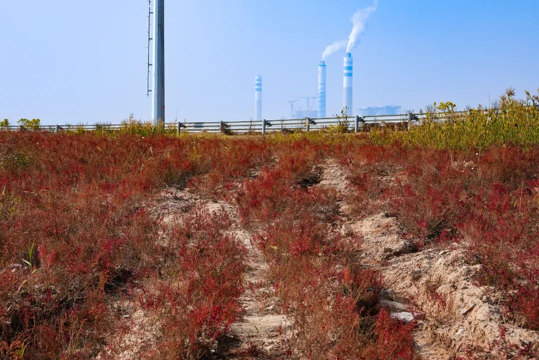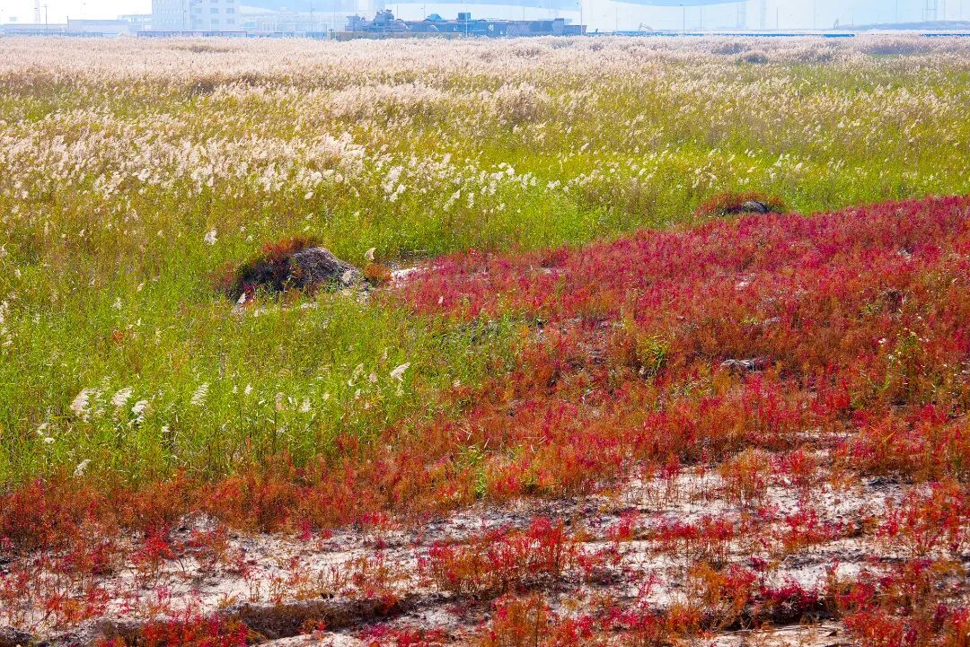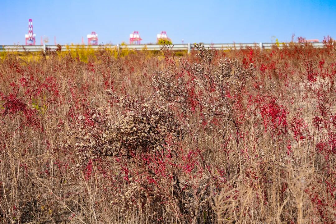 远处的港口传来货轮的鸣笛,悠长的声响穿过红潮时被滤得温润,惊得红蒿梢头的盐霜轻轻颤动,给这片静默的景致,添了几分鲜活的生气。钢铁的冷硬撞碎在草木的柔波里,工业的几何线条与自然的随性曲线在此刻达成绝妙的共生。