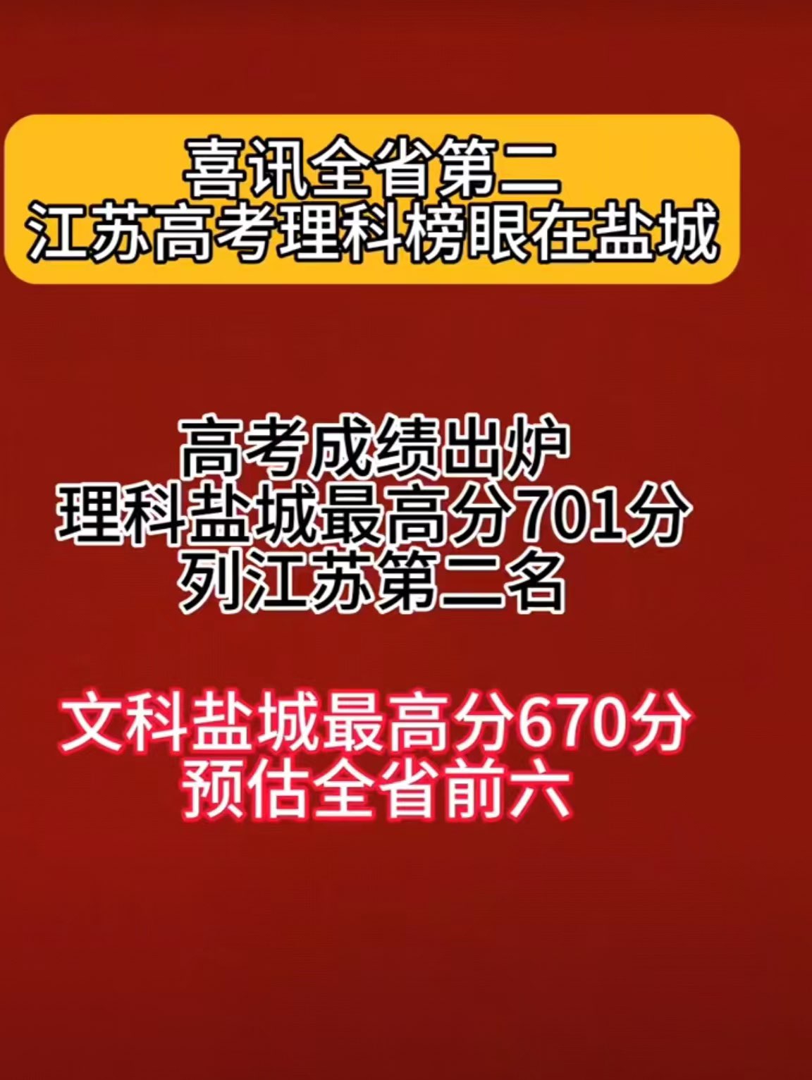 喜讯,全省第二,江苏高考理科榜眼在盐城,高考成绩出炉。理科盐城最高分701分,列江苏第二名。文科盐城最高分670分,预估全省前六。