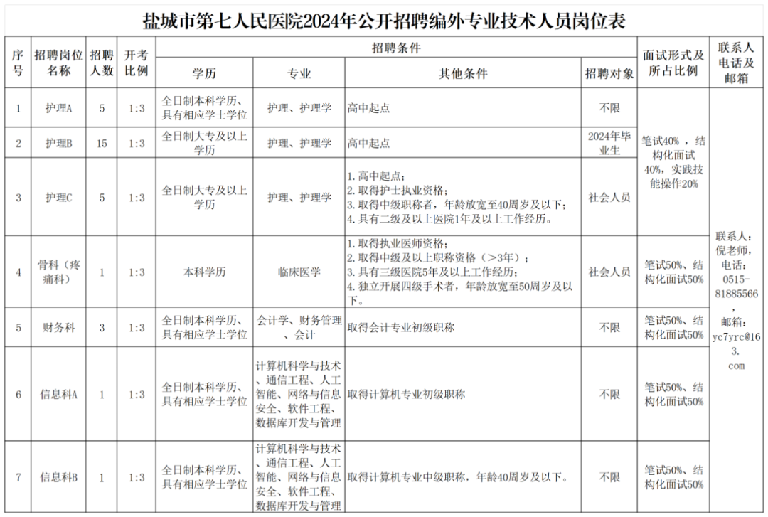 为进一步加强人才队伍建设,更好地选拔优秀适岗人才,优化人员结构,盐城市第七人民医院面向社会公开招聘编外专业技术人员31名。